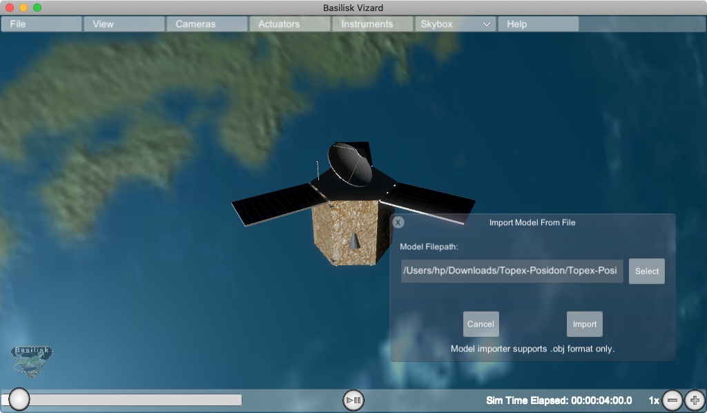 When Vizard starts up it represents the spacecraft using a default CAD model called bsk-Sat. This default spacecraft model can be replaced with with a custom CAD model in an .obj or .glb file format, or by using a built-in shape primitive. Go to the File menu and select Import Model: