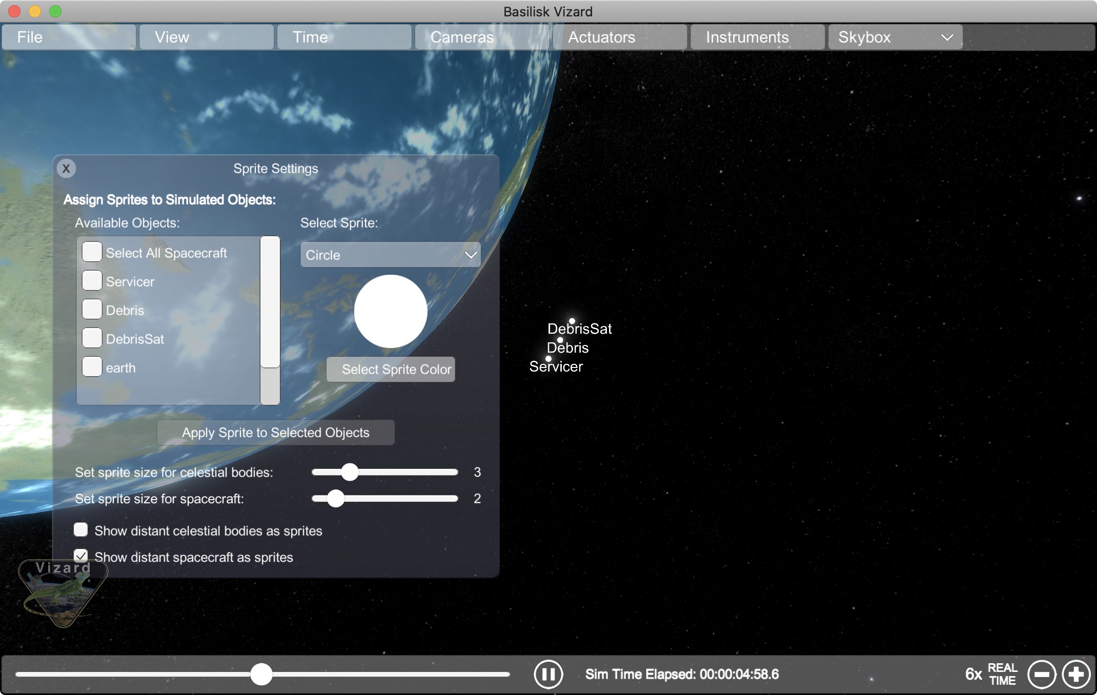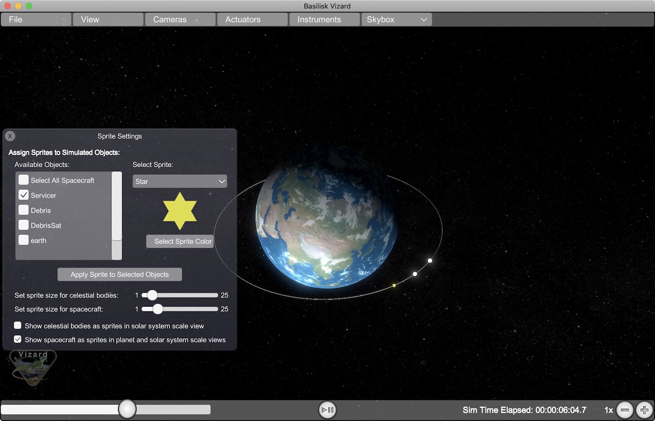 Vizard is setup to show an attitude dependent 3D rendering of a spacecraft model by default. In a planet centric or helio-centric view the spacecraft is enlarged such that the orientation can still be determined. This is the default behavior if a single satellite is shown. However, if multiple satellites are shown then seeing enlarged 3D renderings can both be a large computation hit and confusing to the viewer. Thus, if 2 or more spacecraft are shown, and the view point is planet- or sun-centric, then Vizard defaults to showing the spacecraft locations as 2D sprites.