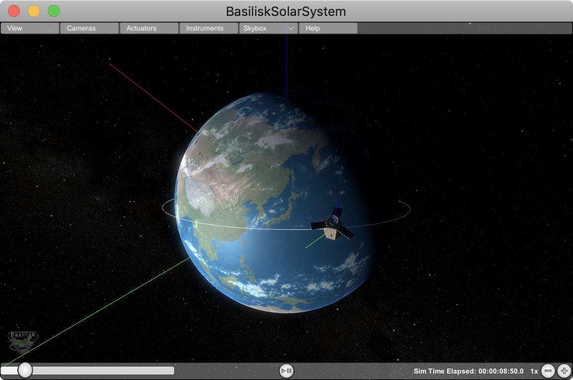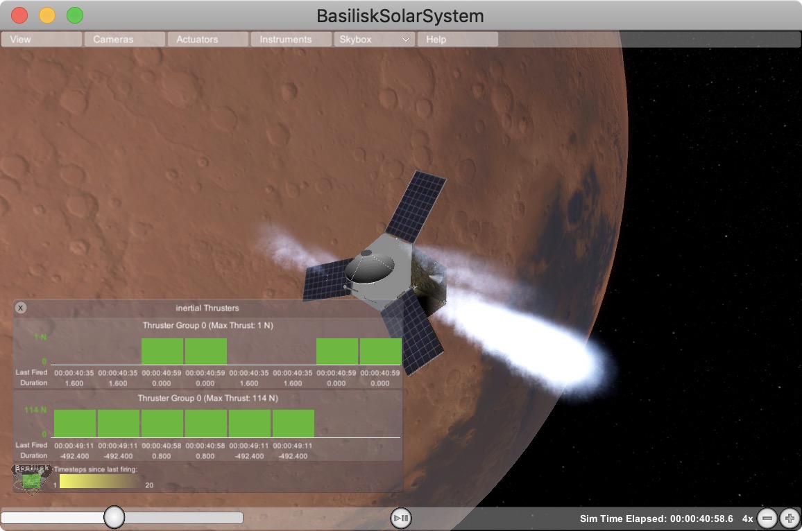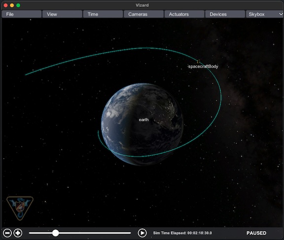 Vizard is able to show the position and orientation of the spacecraft being simulated. If one or more planets are being modeled, then the spacecraft is show relative to the nearest planet.